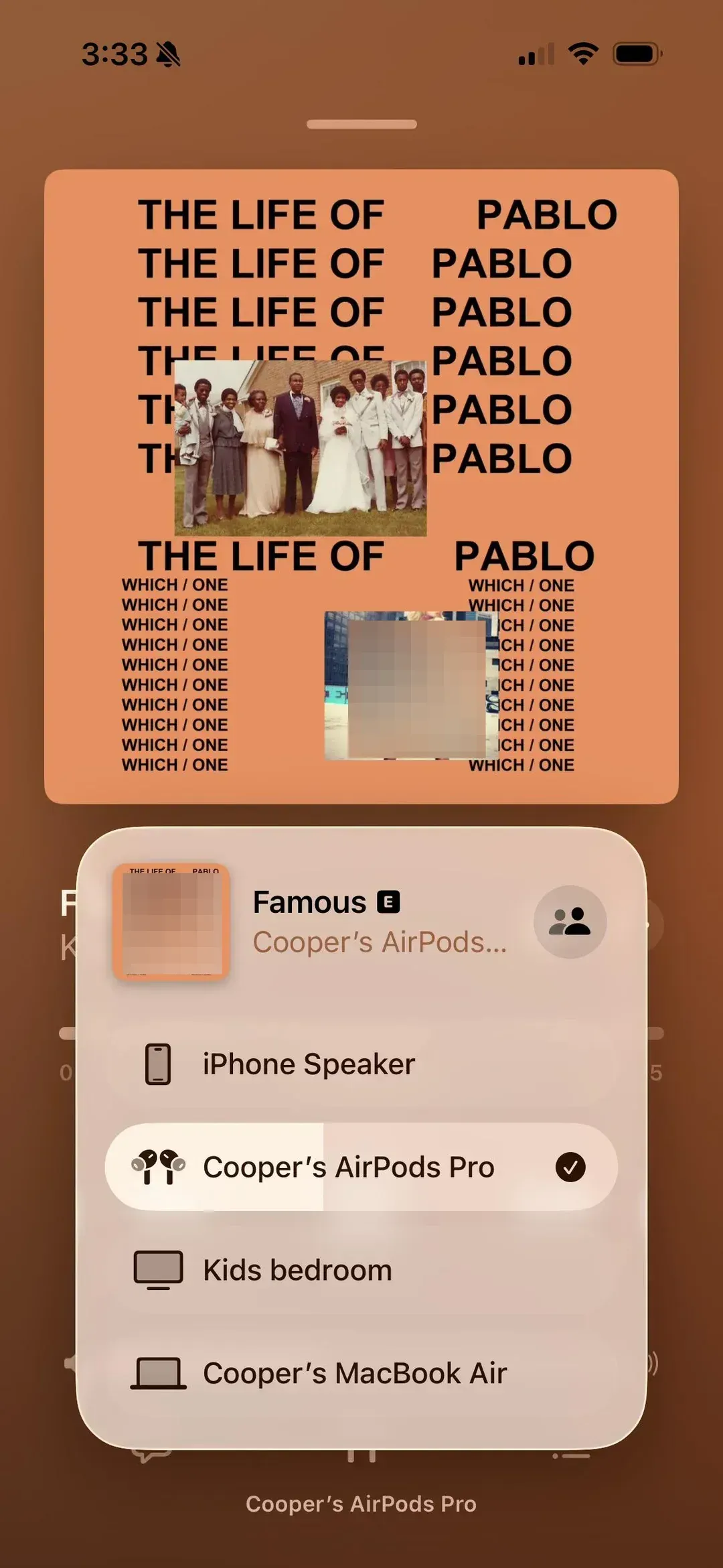 The attached image shows this in action while playing “Famous” from The Life of Pablo, where “Cooper’s AirPods Pro” is selected and the volume bar is now visible right beneath.