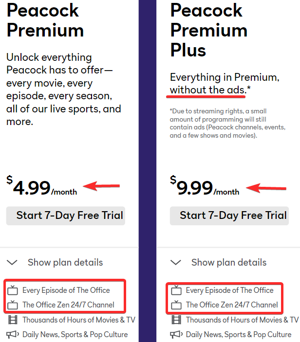 Peacock TV offers a free seven day trial for the Premium and Premium Plus packs. So, if you are looking to binge The Office then you can take the seven-day free trial that is easily cancellable.