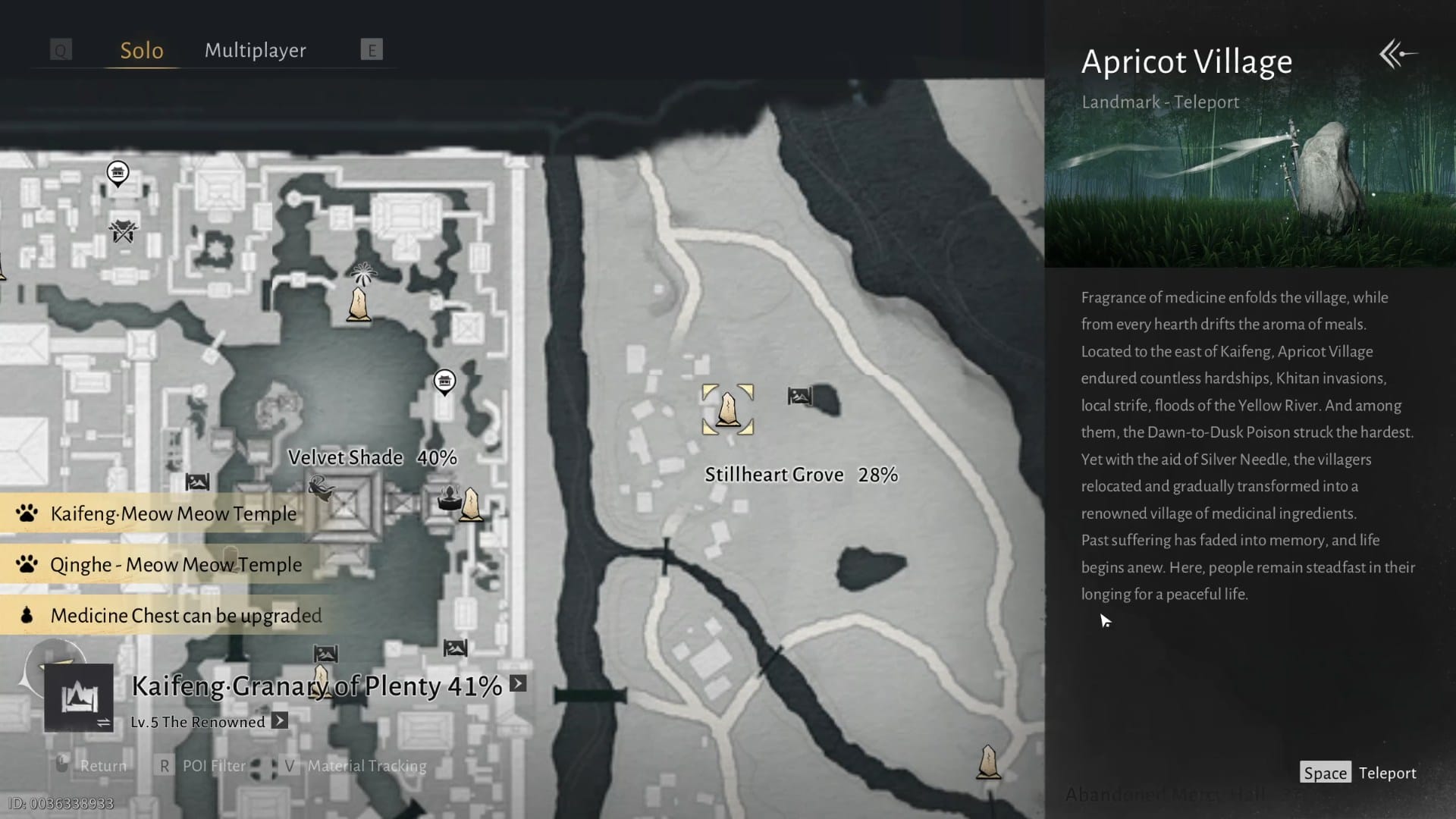 The quest takes place in Apricot Village, in Stillheart Grove, Granary of Plenty, Kaifeng region. The exact location is given below.