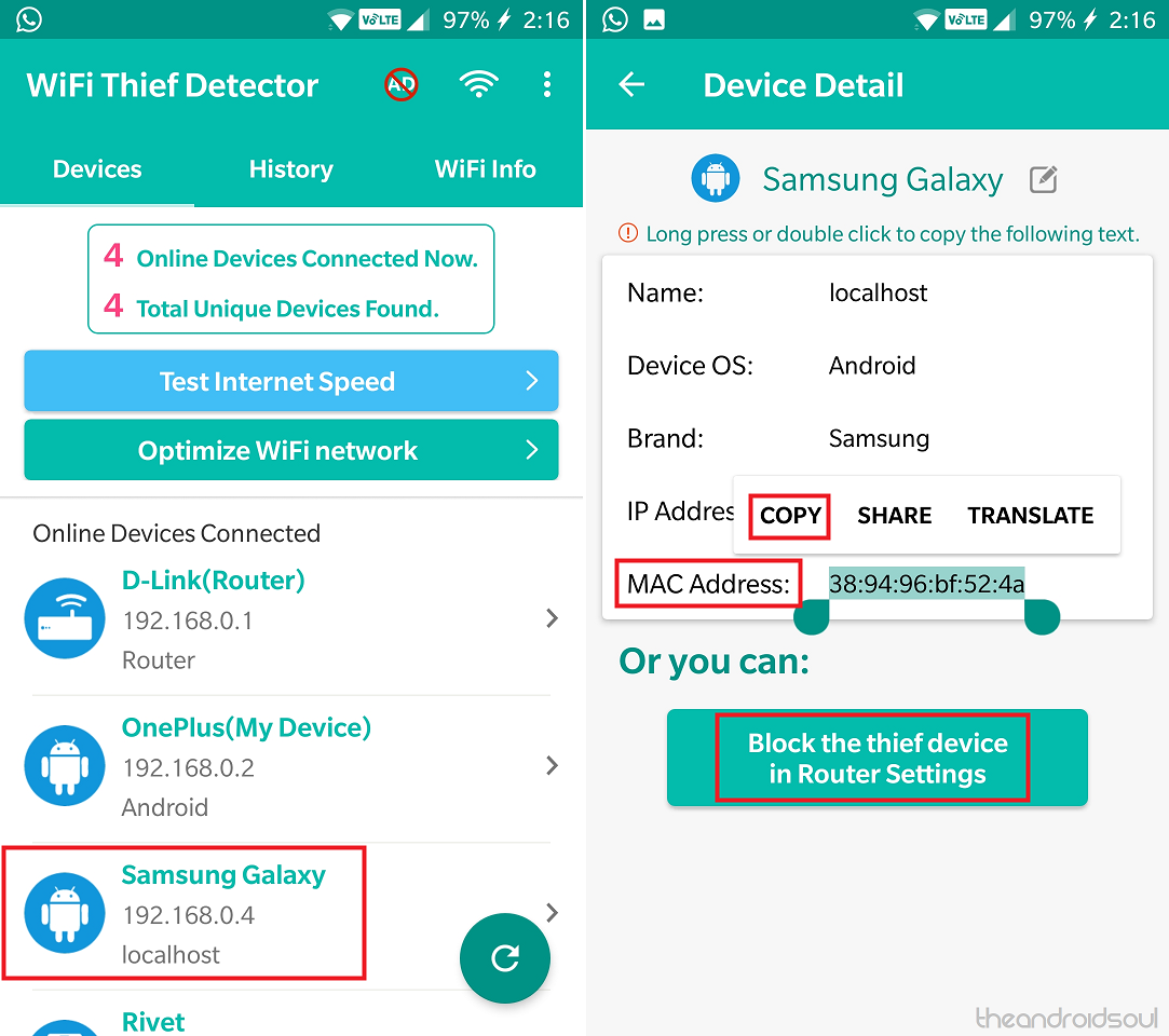 - Once you’ve copied the MAC address, tap on the button that says ‘Block the thief device in Router Settings’.