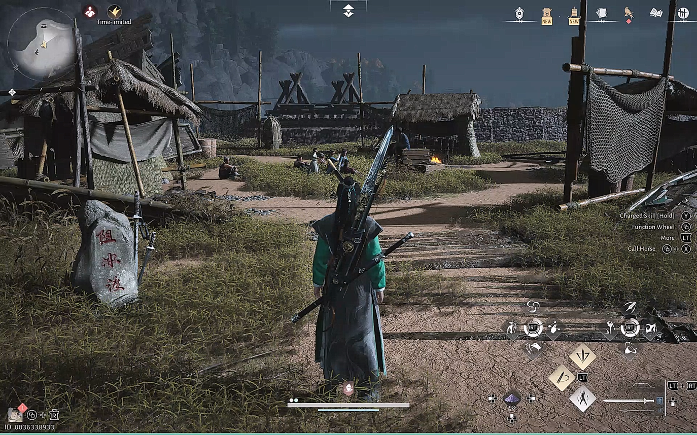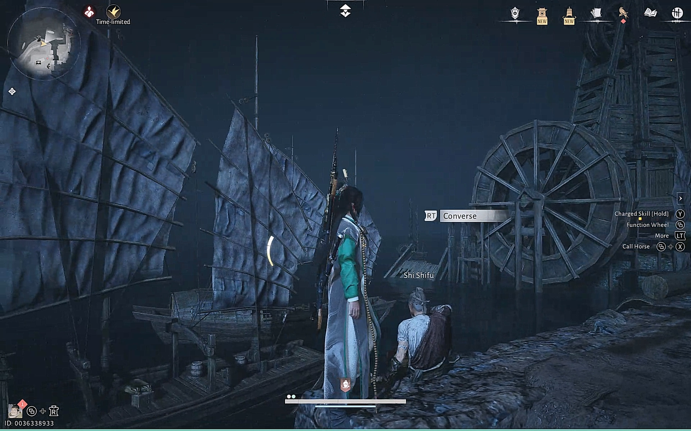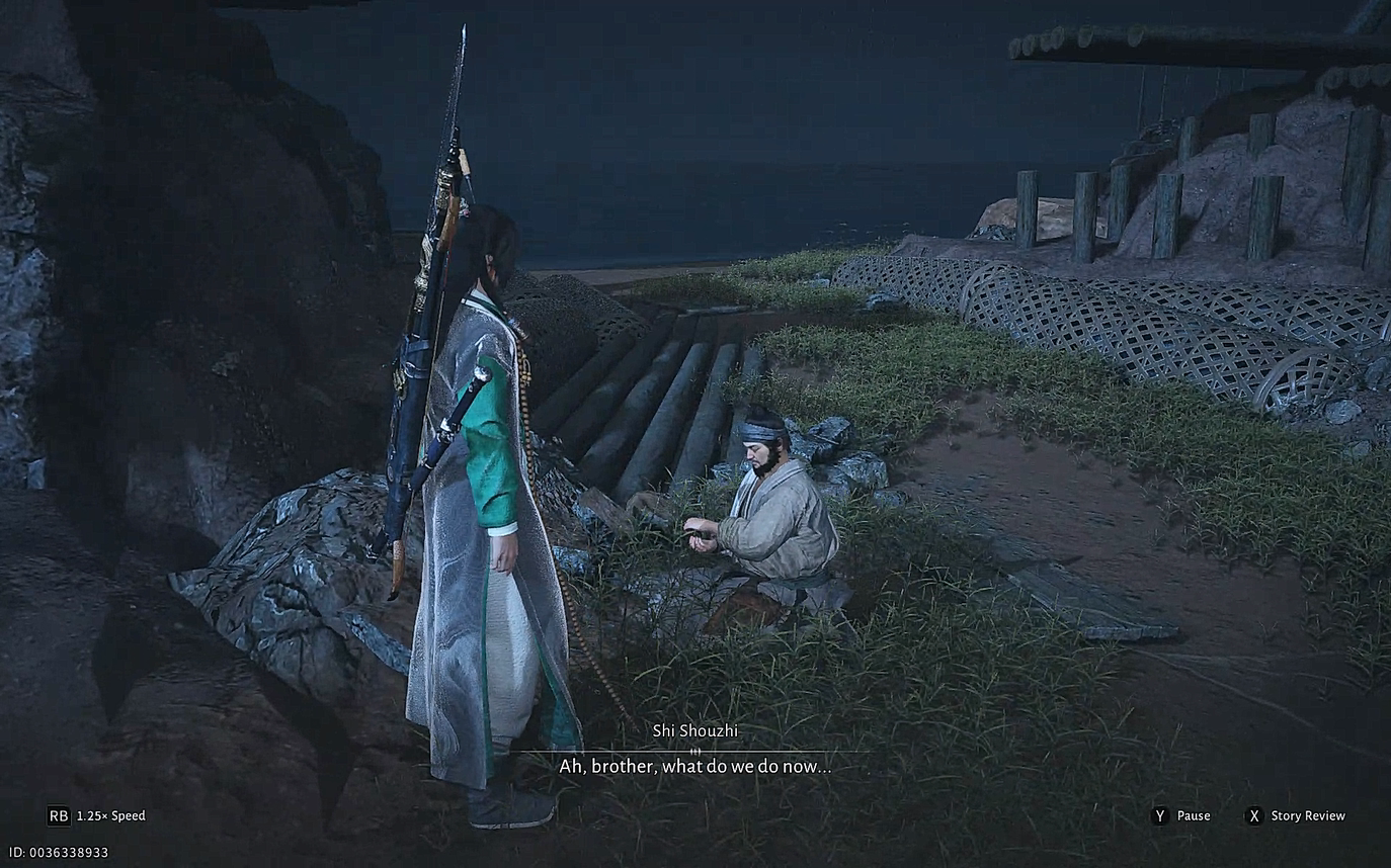 From the starting location, explore the area and find Shi Shouzhi. He will be present on the left near the rock establishments.