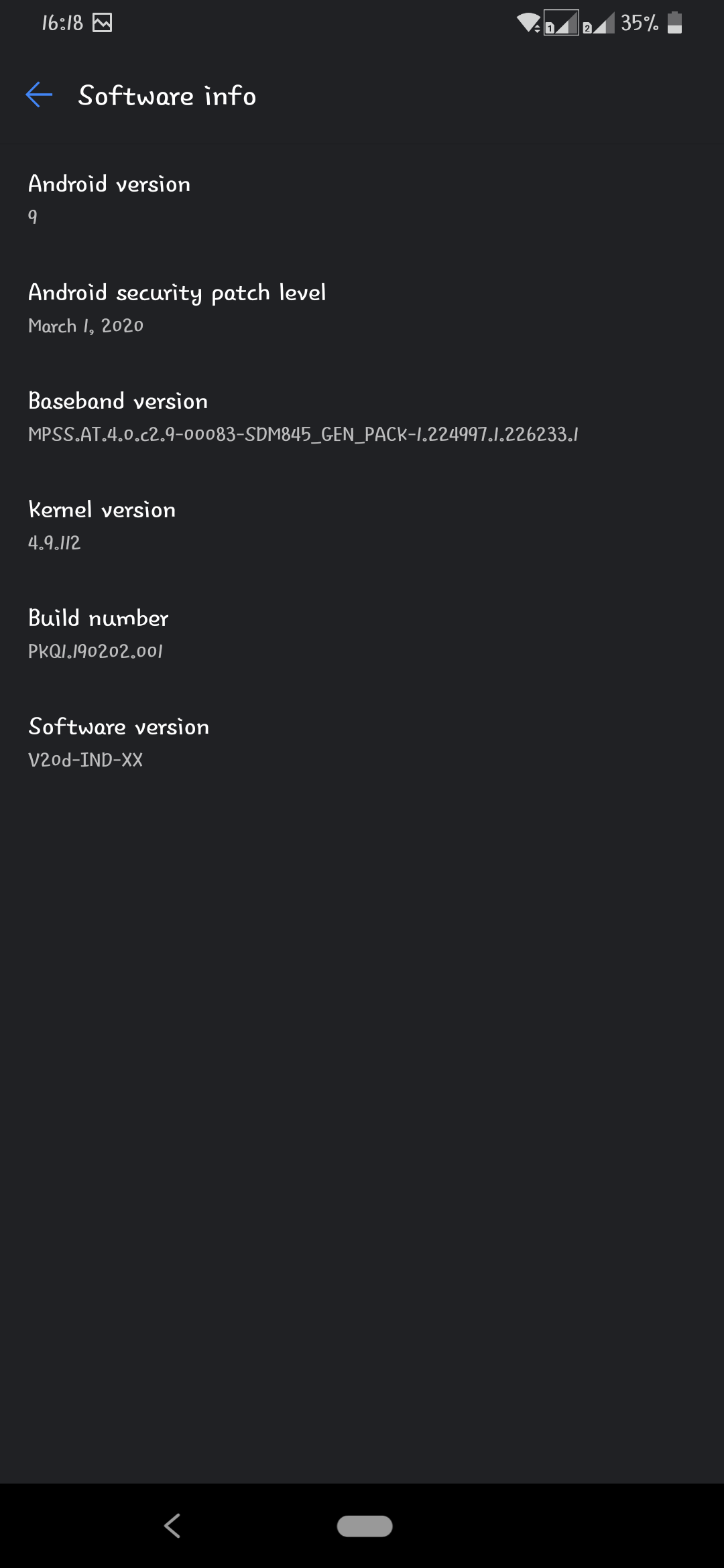 | 10 Apr 2020 | V20d (India) — March 2020 security patch Brings new features like Wi-Fi calling, Screen recorder, Digital Wellbeing, and more Status bar icons. Size: 709.53 MB |