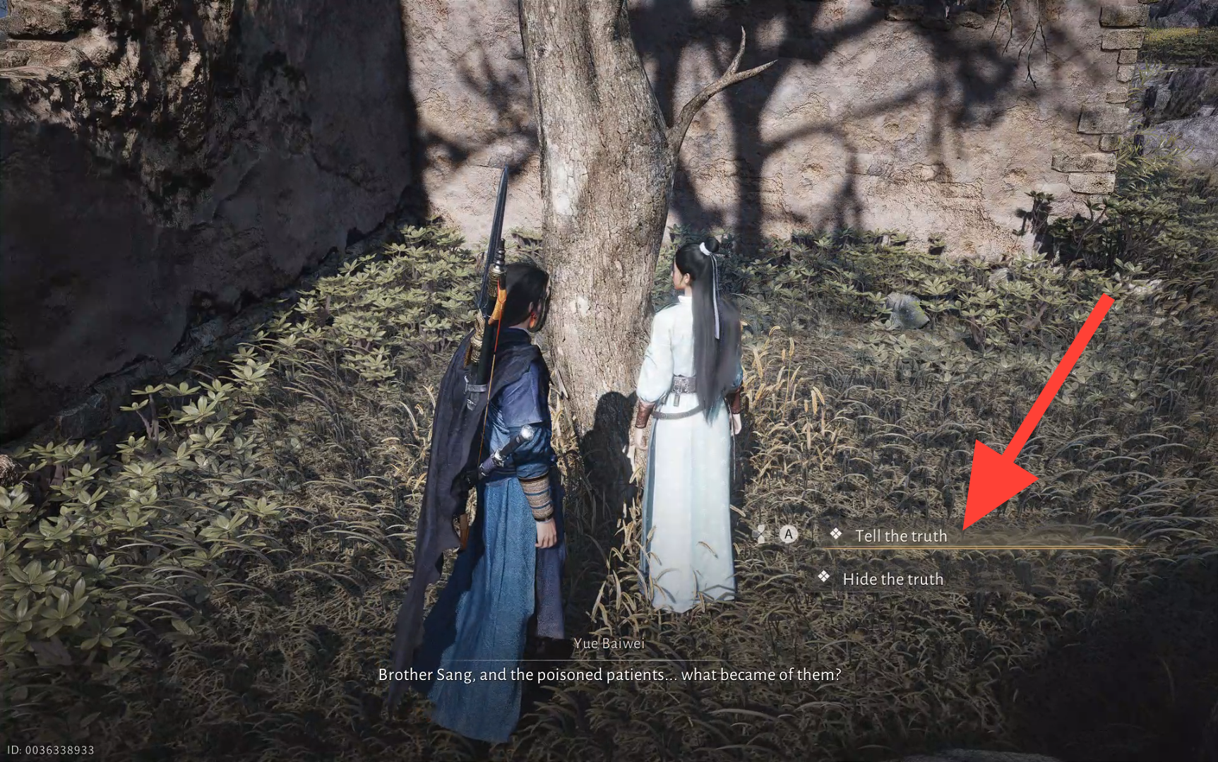 Head back to Yue Baiwei near the Mercy Hall Boundary Stone and tell her the truth to finish the Wandering Tale and claim your rewards.