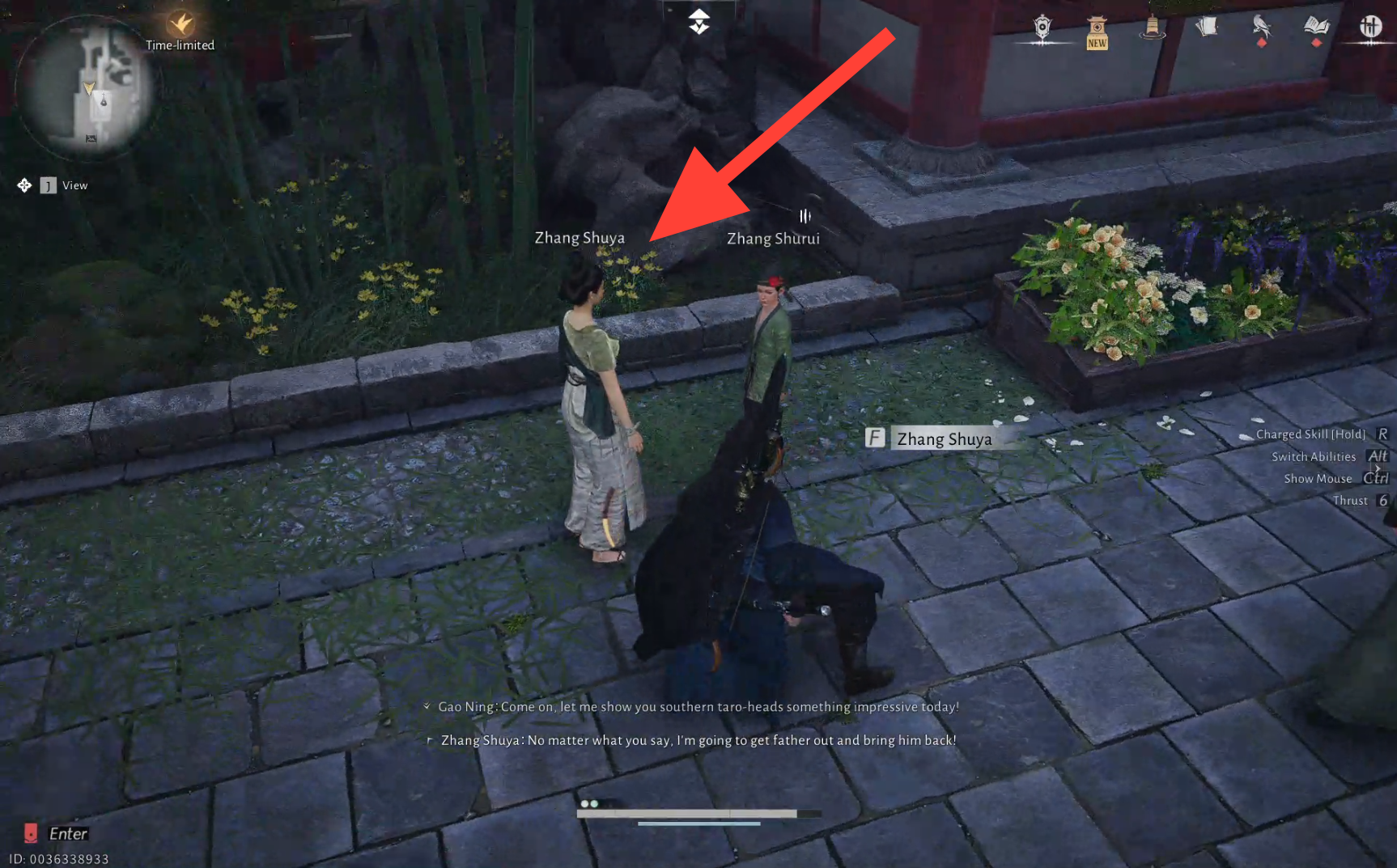 After reaching the marked location in Velvet Shade, speak with Zhang Shuya, who is standing with Zhang Shurui.