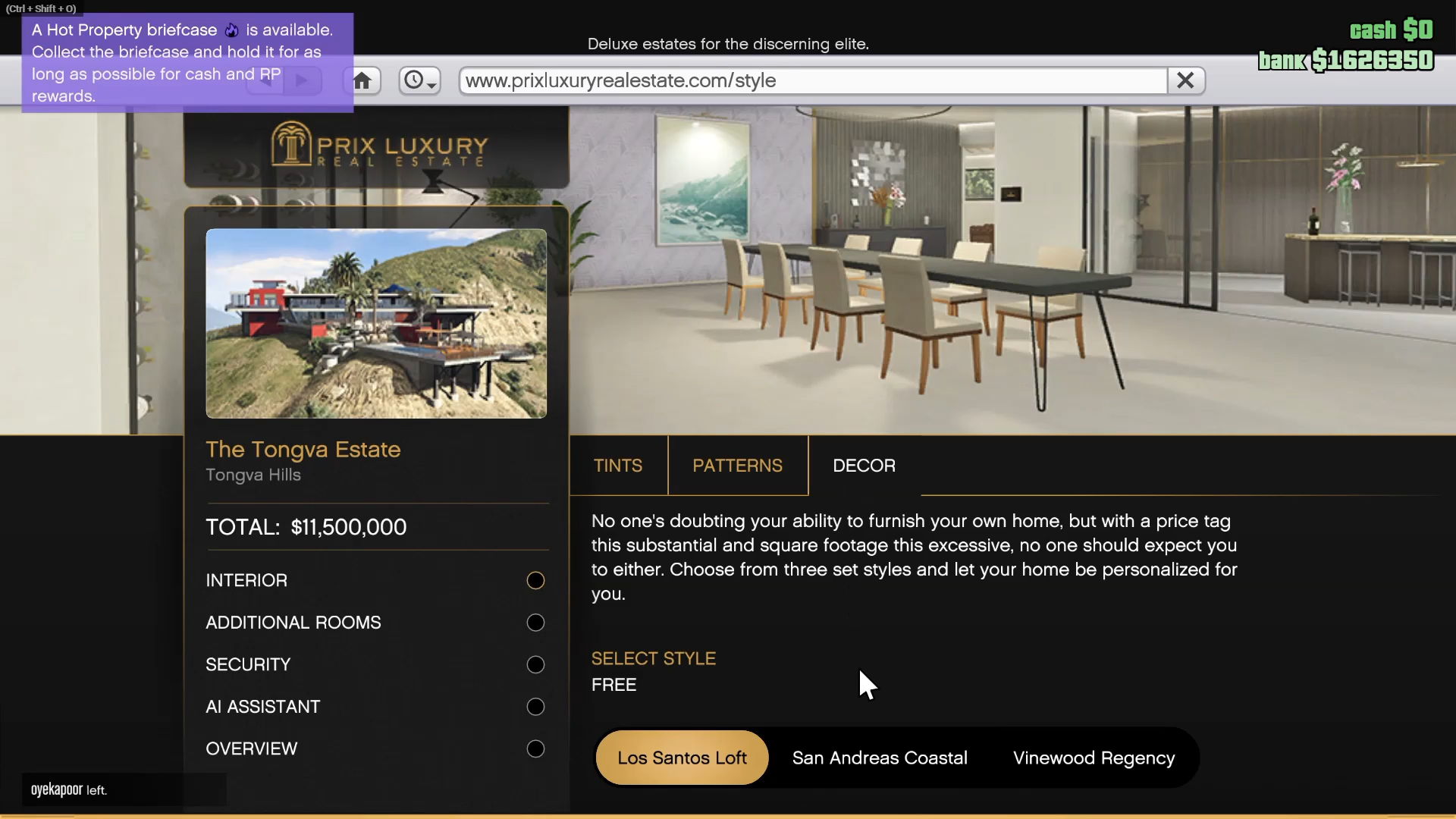 - Décor Styles: Los Santos Loft / San Andreas Coastal / Vinewood Regency