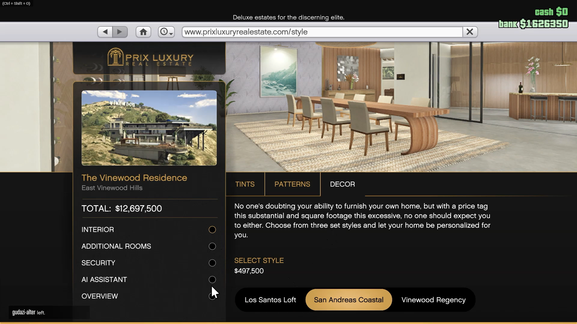 - Décor: Los Santos Loft / San Andreas Coastal / Vinewood Regency