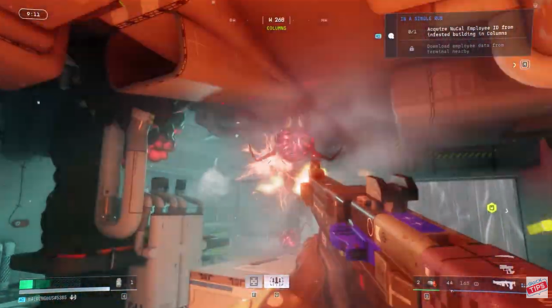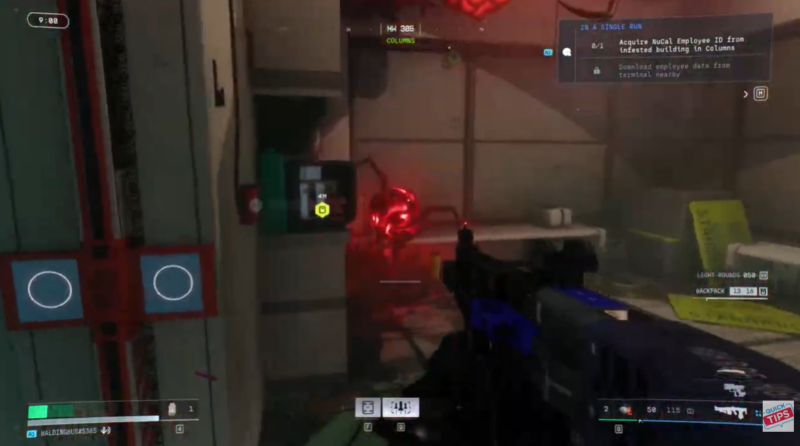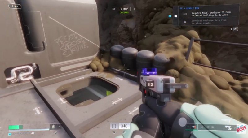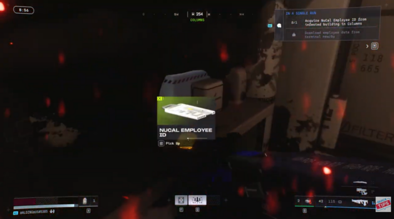 Begin by traveling to the infested building located in the Columns sector, which is specifically marked as part of the mission objective requiring the Nucal Employee ID. Approach the structure carefully because enemy patrols and environmental hazards may already be active around the perimeter.