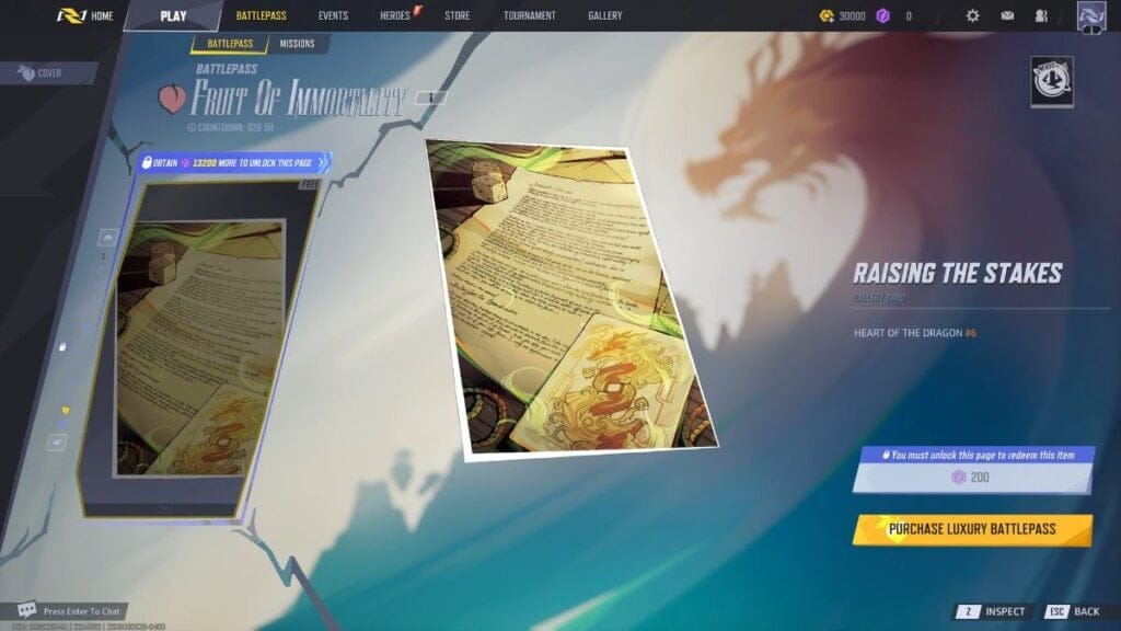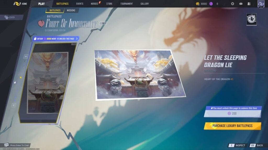 The Fruit of Immortality Battle Pass spans 12 pages, each requiring Chrono Tokens earned from gameplay, daily quests, and events to unlock rewards. Progress feels straightforward as matches and challenges accumulate tokens naturally, allowing dedicated players to complete the pass within the season's duration. Free track items appear on every page, while premium ones demand the Luxury upgrade.