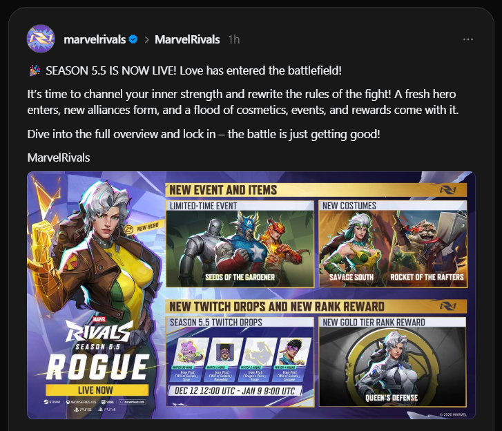 Marvel Rivals Season 5.5 has gone live. The mid-season patch (version 20251212) continues Season 5 with "a new hero, new map, fun events, and fantastic costumes". The updates comes on the back of a trailer drop for the Marvel Rivals Season 6.