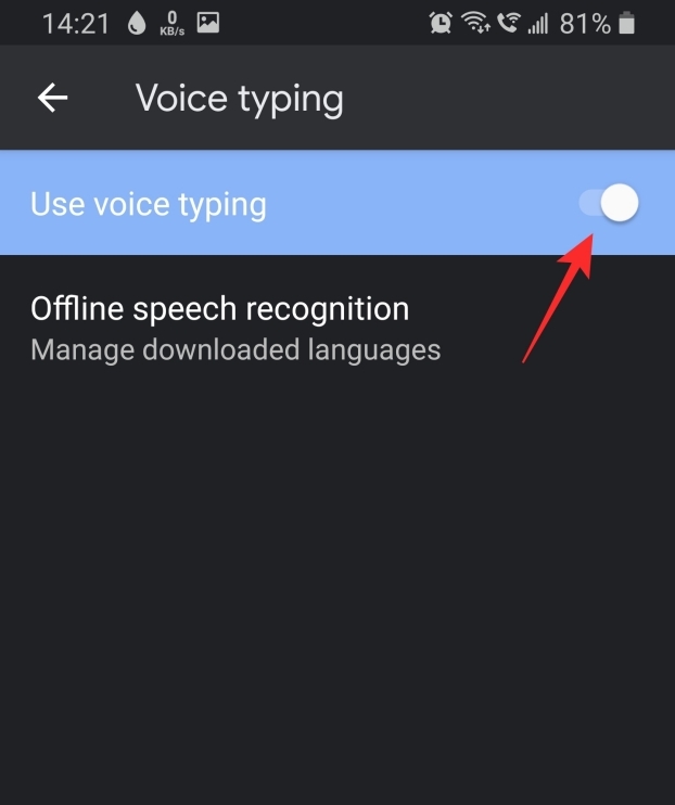 Now select ‘Manage keyboards’. Toggle ‘Google voice typing’ on.