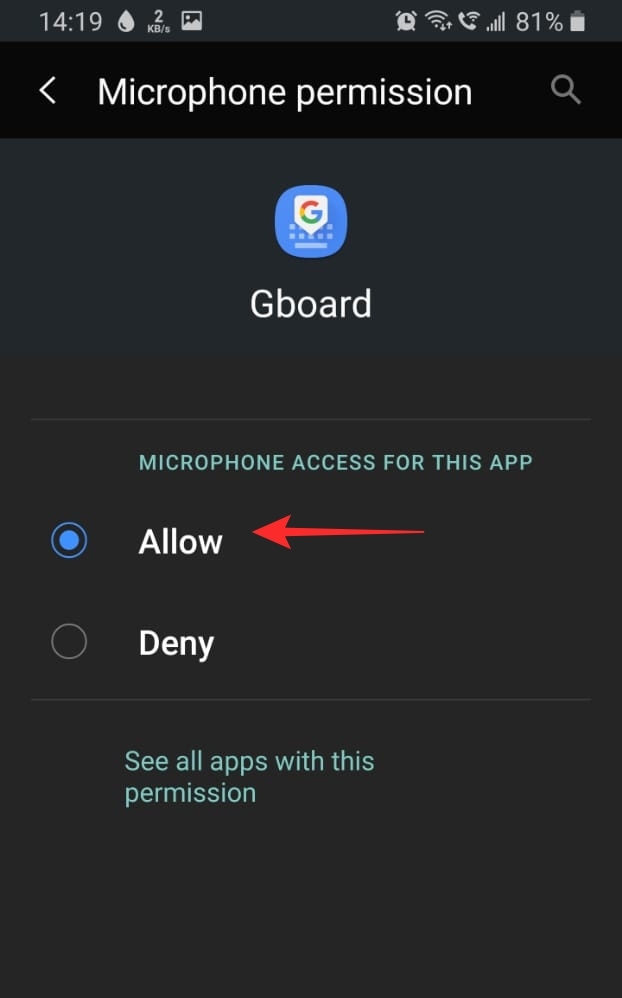 To enable microphone permission for your Gboard app, open your device Settings, and go to Apps > Gboard.