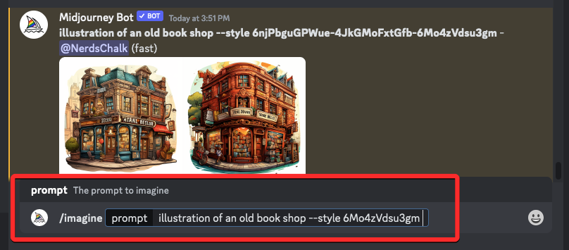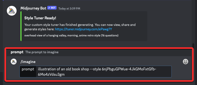 Now, enter your desired prompt inside the “prompt” box and then add the --style code1-code2-code3 parameter at the end of the prompt.