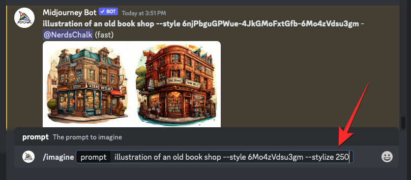 Now, enter your desired prompt inside the “prompt” box and then add the --style <code> parameter at the end of the prompt. Here, replace <code> with the generated style code you copied. When the prompt is ready, press the Enter key on your keyboard.