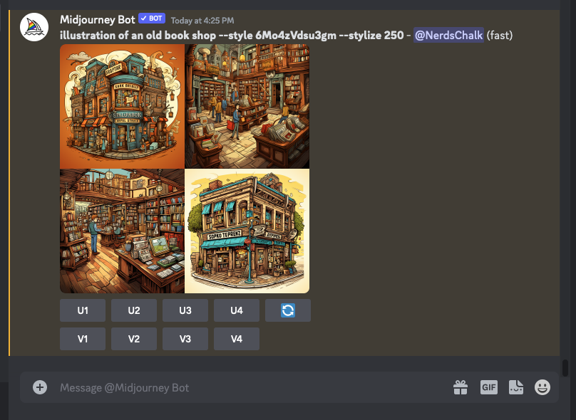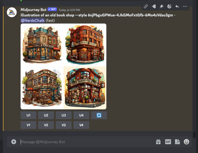 With the style code generated inside the Style Tuner page, you can go back to the Midjourney Discord tab on your web browser to create images based on the fine-tuned aesthetic.