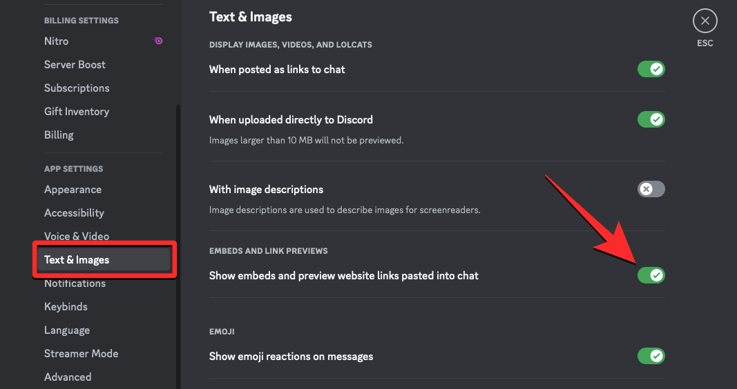 When Discord settings open, scroll downwards on the left pane and go to App Settings > Text & Images. Here, turn on the Show embeds and preview website links pasted into chat toggle under “Embeds and Link Previews”.