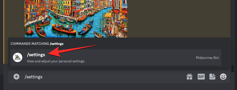 Regardless of where you access Midjourney, click on the text box at the bottom. Here, type /settings, select /settings from the menu, and then press the Enter key on your keyboard.