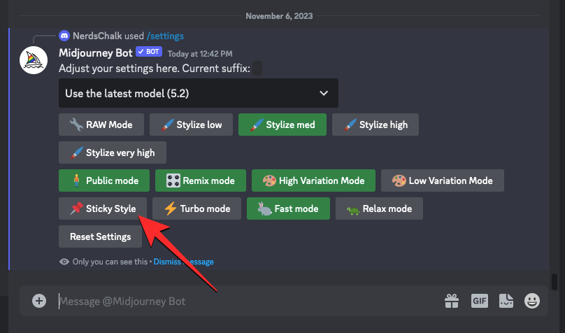 If you prefer using a style code that you recently used, you can save it for all future generations using the Sticky Style option inside Midjourney settings. To save the last-used style code, open any of Midjourney’s servers or the Midjourney Bot on your server or Discord DM.