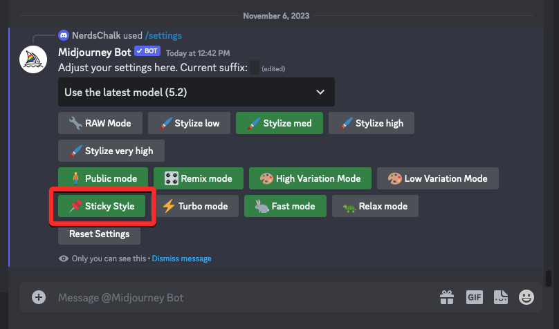 The Sticky Style option will now be highlighted with a green background to indicate that your last used style code is now applied to your future prompts.