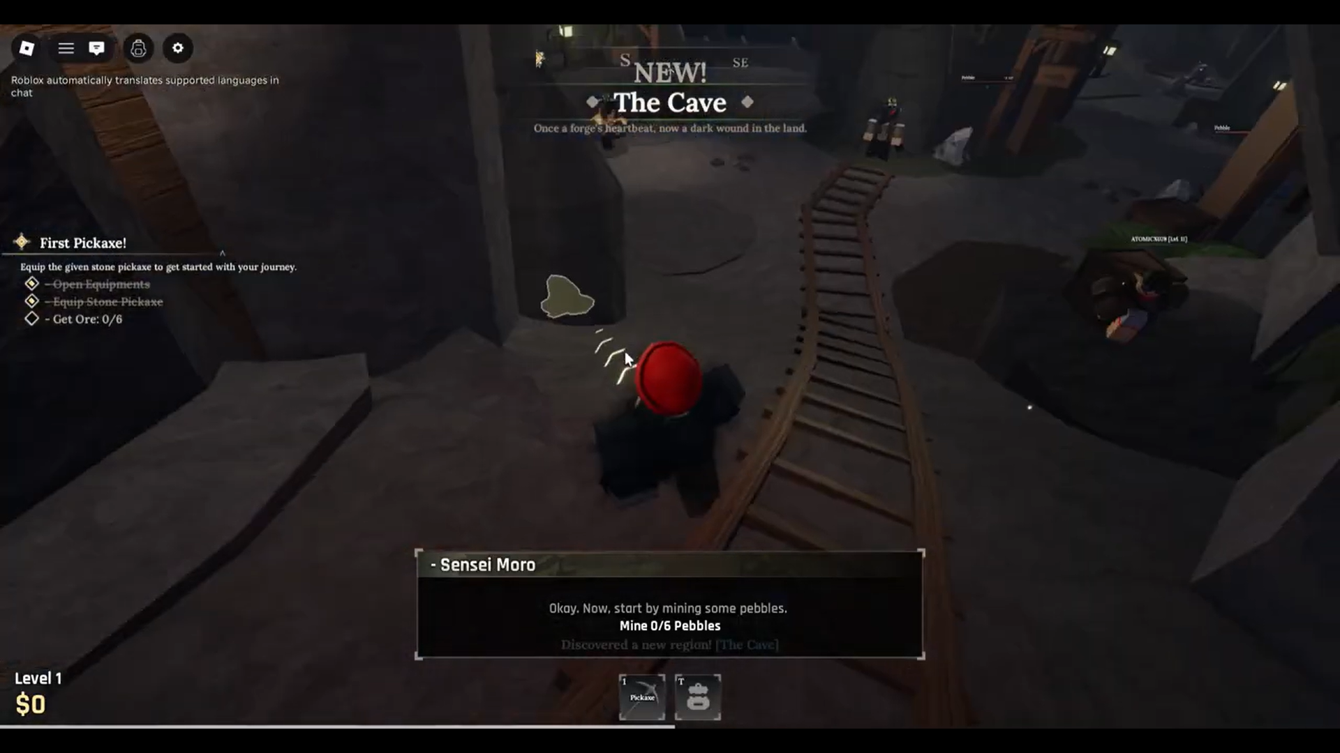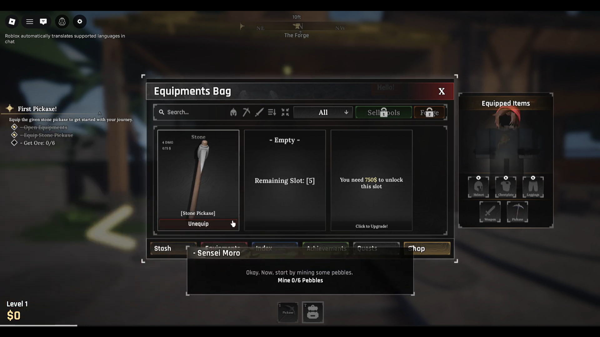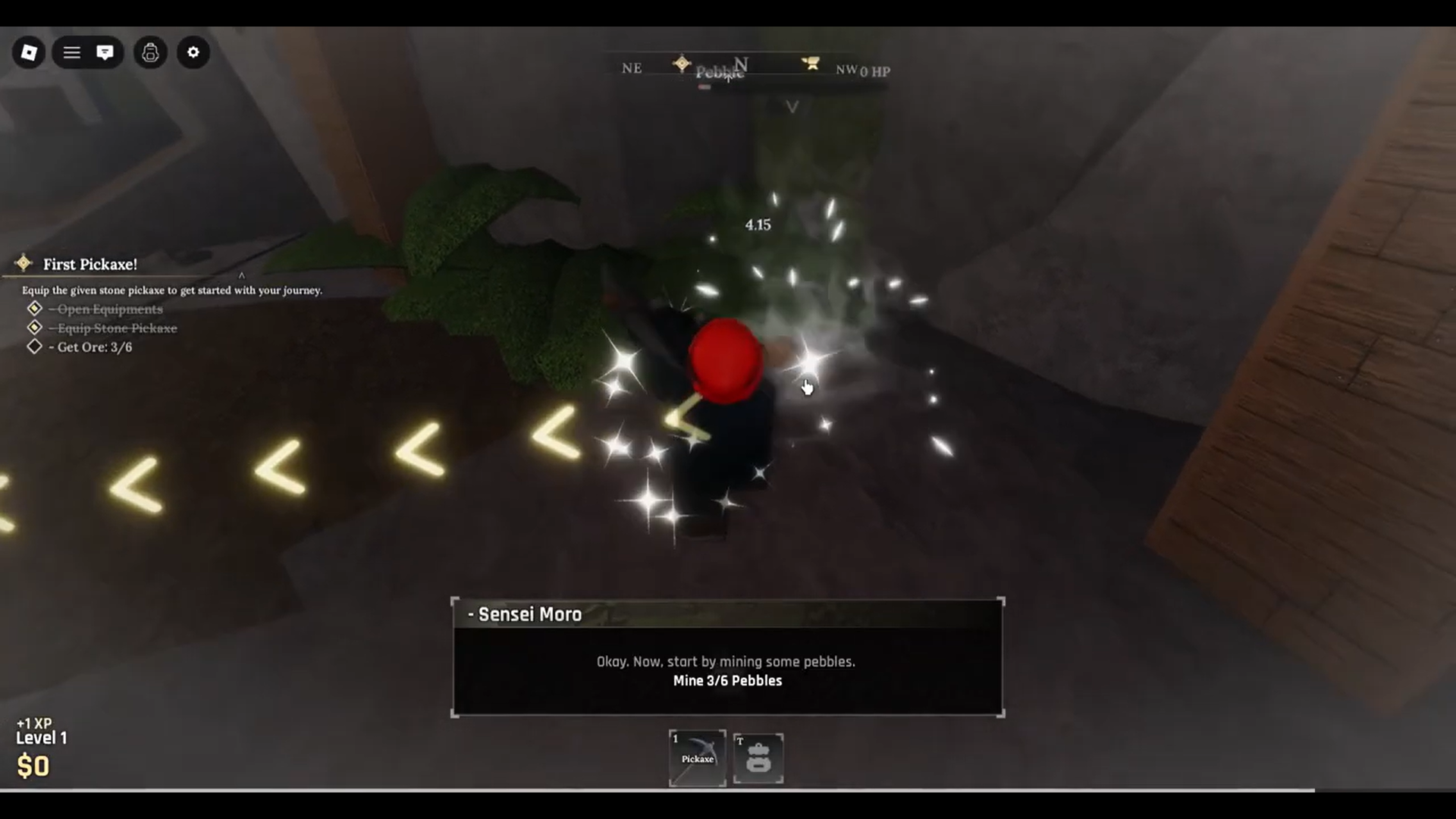 Start by equipping your mining equipment. Initially, you get a pickaxe. Equip it.