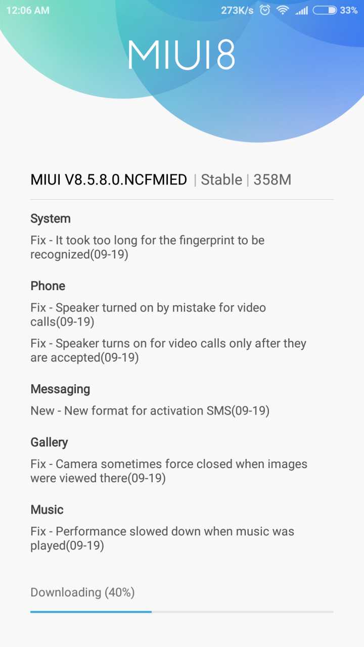 The new MIUI update 8.5.8.0 weighs around 358MB. It brings improvements such as time taken to recognize fingerprints has been reduced and performance of the device has been greatly improved when music is played, which otherwise was slowed down.