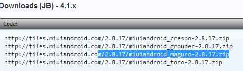 - Download the latest version of the ROM from the development page. Download the “maguro” version of MIUI under the 4.1.x heading (as highlighted in screenshot below).