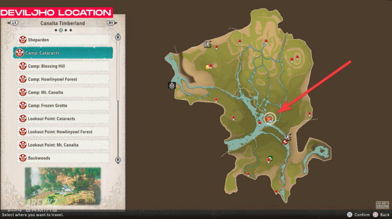 Deviljho can appear in the northeastern section of Canalta Timberland, specifically along the river that runs through the region. This area contains open forest terrain and riverbanks where high-tier monsters occasionally roam. If you explore the river path thoroughly, you may spot Deviljho wandering the map.