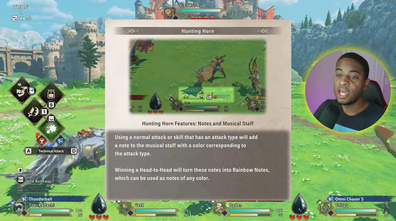 - The Hunting Horn builds melodies using Power (Red), Speed (Blue), and Technical (Green) notes generated from attacks.