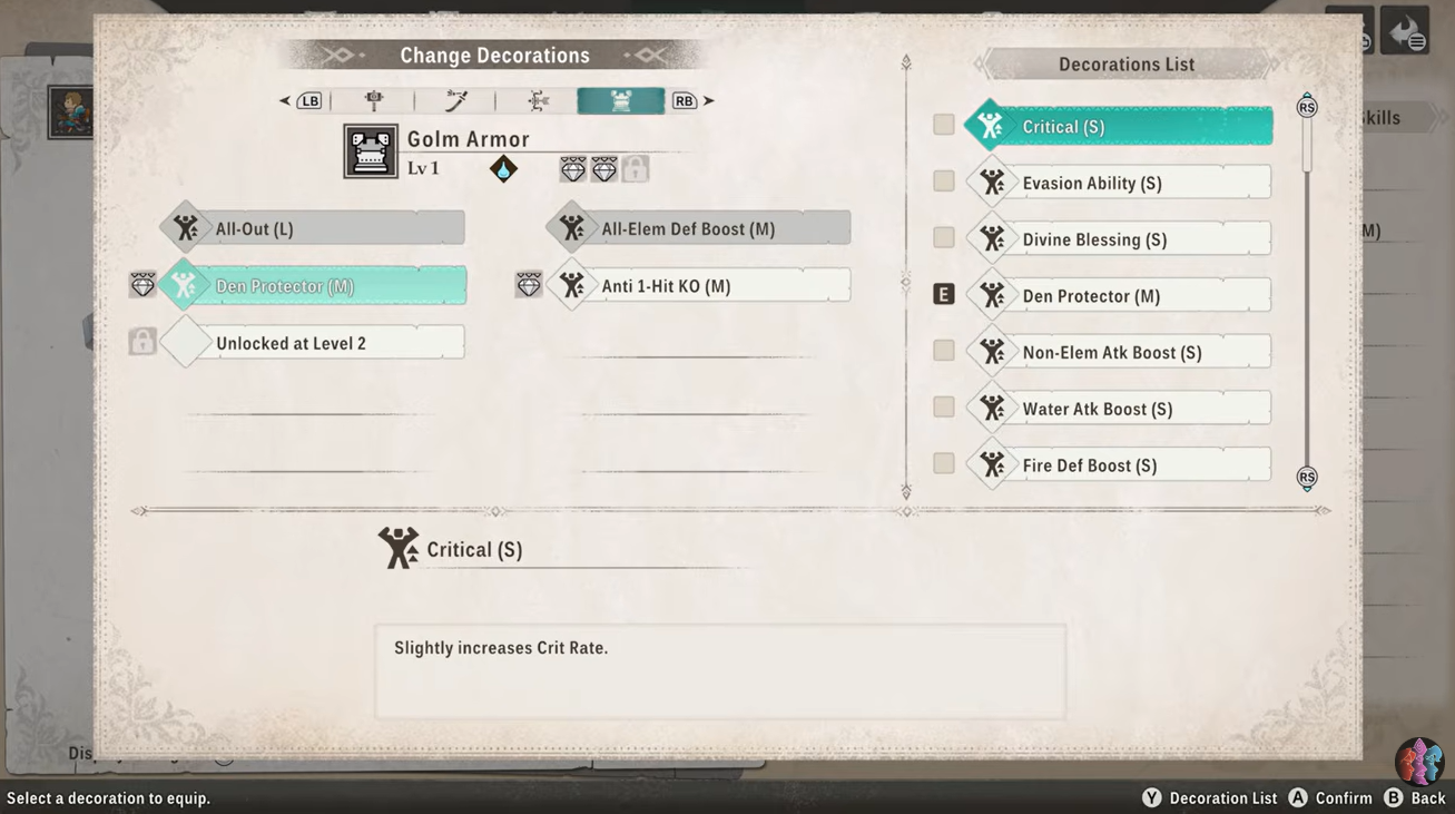 Decorations function as upgrade gems that can be inserted into equipment. These gems enhance your stats or provide special combat skills.
