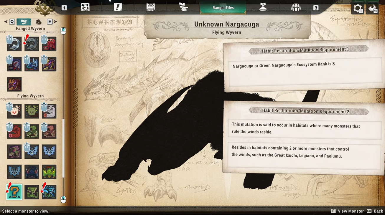 The core mechanic behind unlocking Silverwind Nargacuga revolves around ecosystem rankings. You need to raise two specific monsters to the highest ecosystem tier. First, you must obtain a regular Nargacuga and raise its ecosystem level to S-Rank within the region. This typically involves placing the monstie into the environment and allowing it to thrive within the area so its ecosystem influence increases. After completing that step, you must repeat the same process with Green Nargacuga, ensuring that both monsters reach the S-Rank level. Achieving this rank signals that the environment is fully stabilized for both variants, which sets the stage for the mutation event.