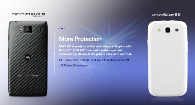 Motorola also attacks Samsung for something that the latter is quite often criticized for – the build quality. Motorola makes a point about the durability of the RAZR HD with its “KEVLAR fiber and water-repellent nanocoating”, saying that the Galaxy S3’s “plastic back can’t say the same”.