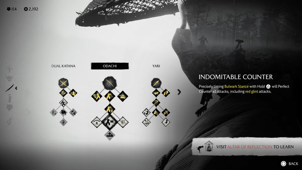 Open your Technique menu and spend points on prerequisite Odachi abilities such as Bulwark Stance or Tranquil Strike to unlock the path leading to Mountain Breaker.