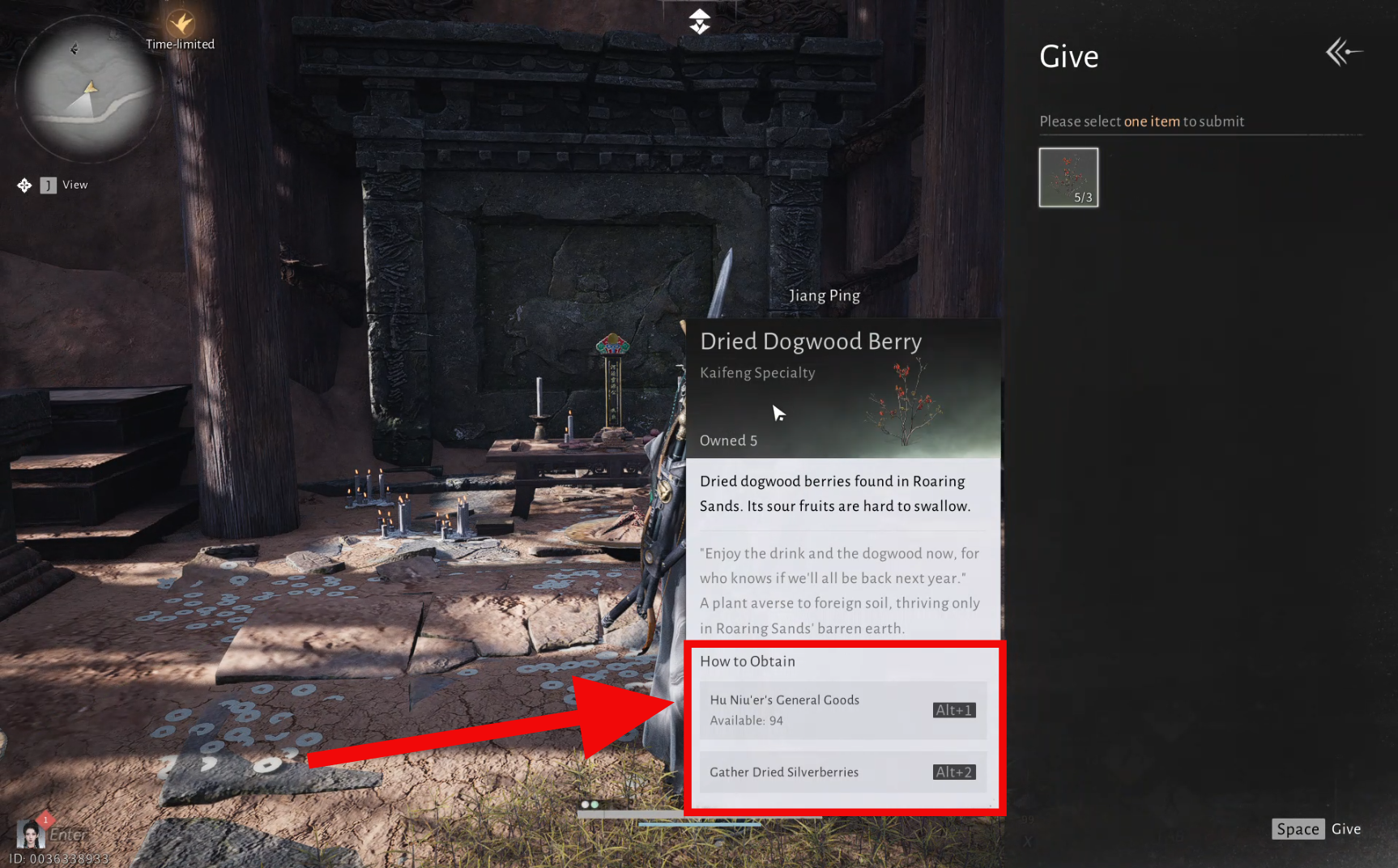 Jiang Ping will ask you to get 3 Dried Dogwood Berries. You can buy them from Hu Niu'er's General Goods in Kaifeng City.