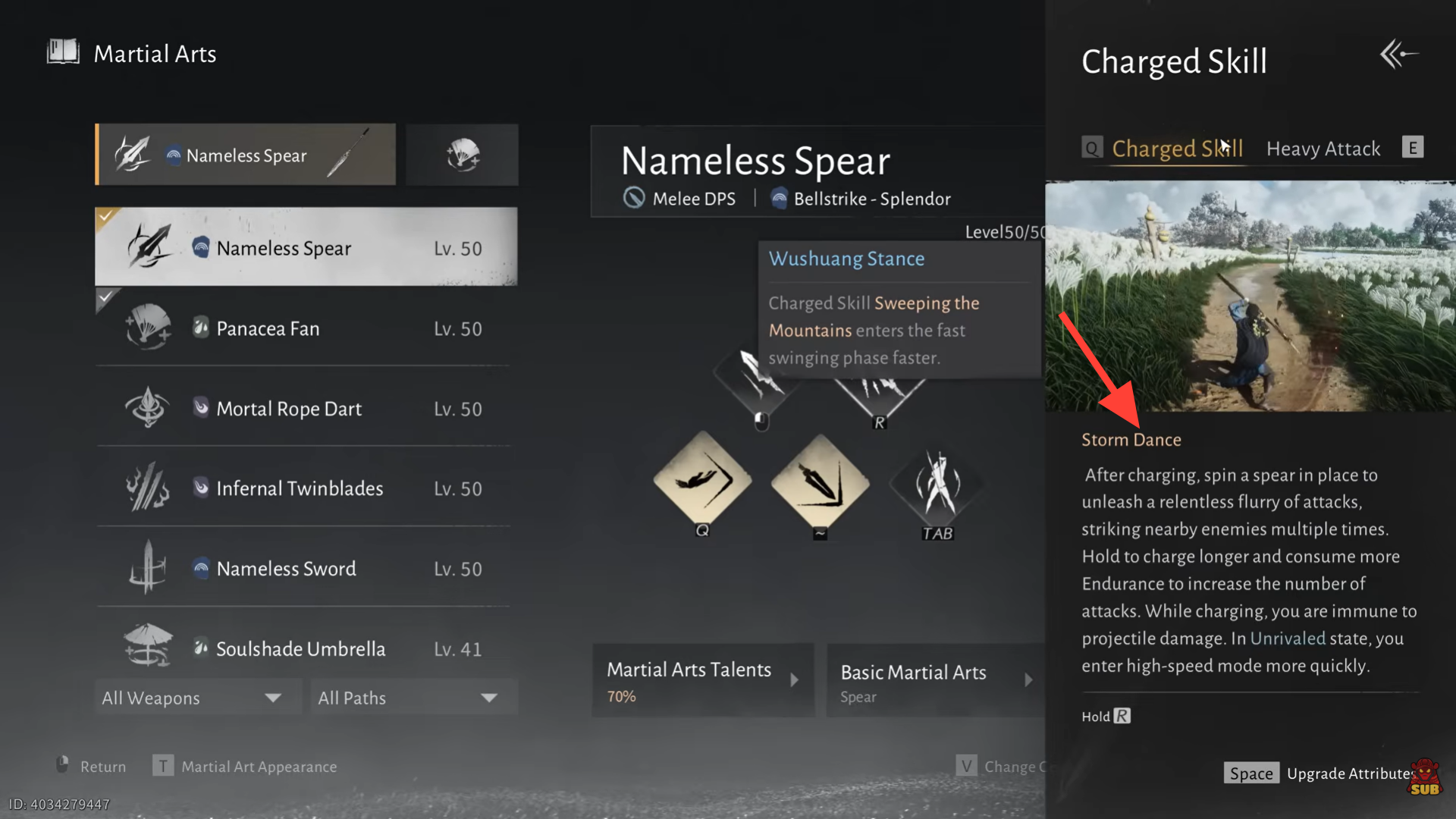 - Storm Dance is the spear’s defining move. By charging a heavy attack, you spin the spear rapidly, striking multiple enemies.