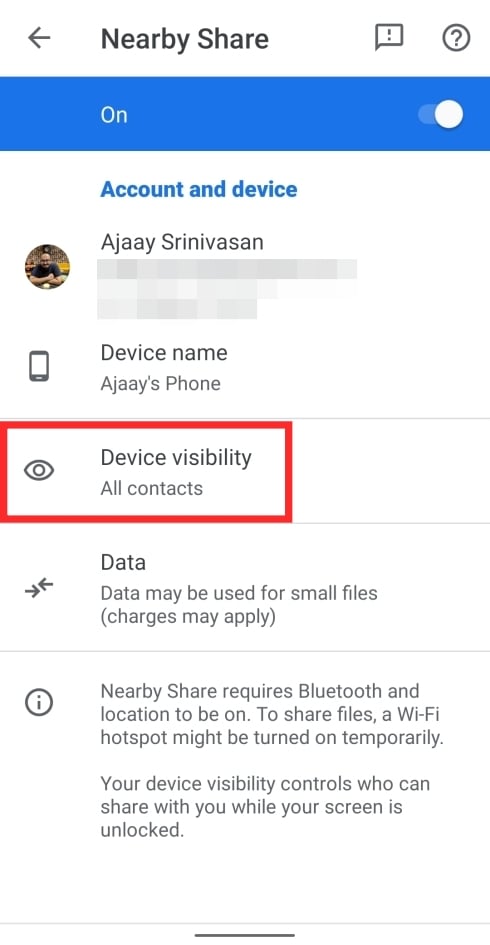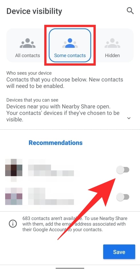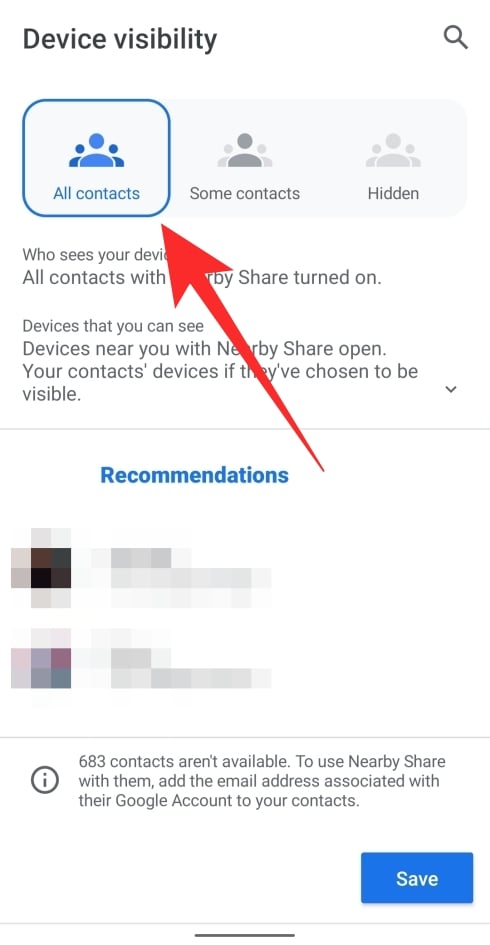 When you’re unable to receive using Nearby Share and you have tried all the steps mentioned above, then chances are that you have modified the Device visibility settings of Nearby Share. Google lets you choose between three options for device visibility: All contacts, Some contacts, and Hidden.