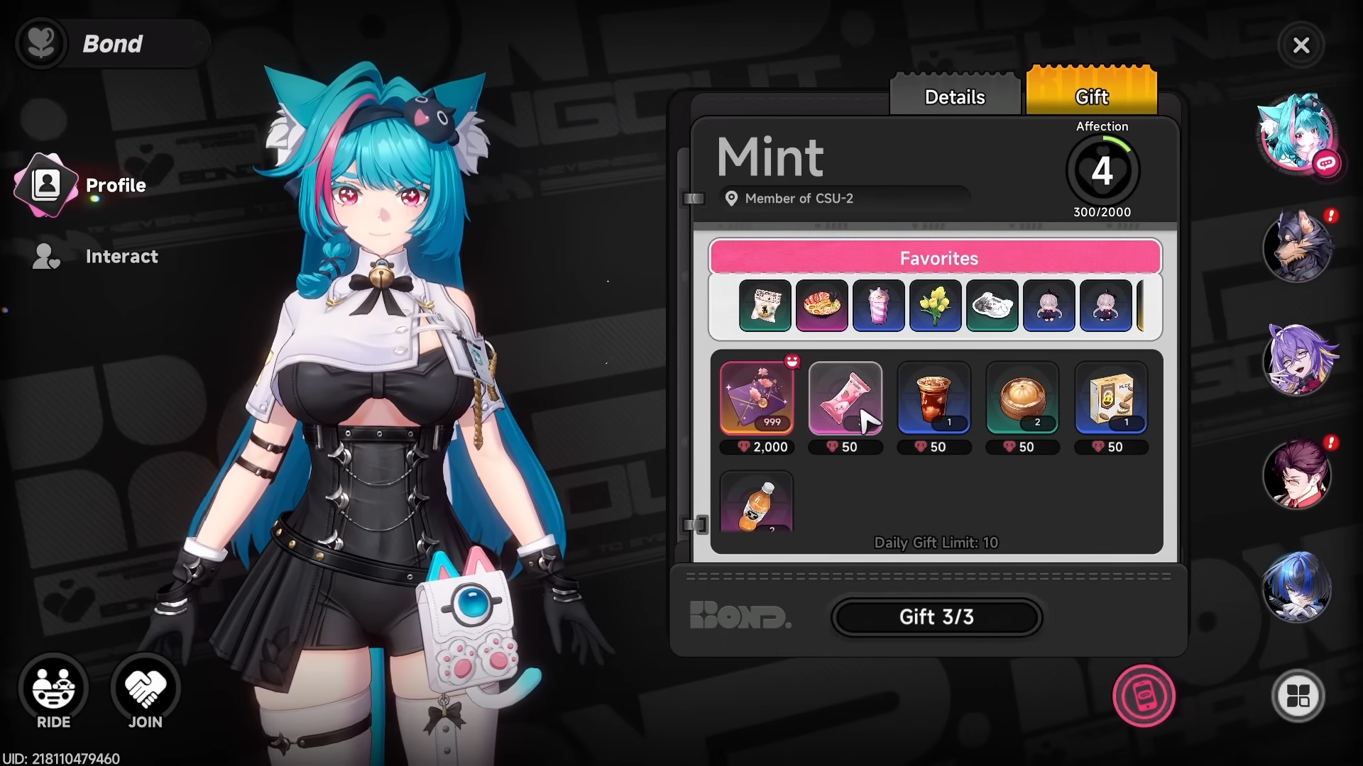 Affinity appears in the bond menu, where you can view affection, bond rewards, and gift options. Higher affinity unlocks more interactions and more rewards, so housing is both a social and mechanical system.