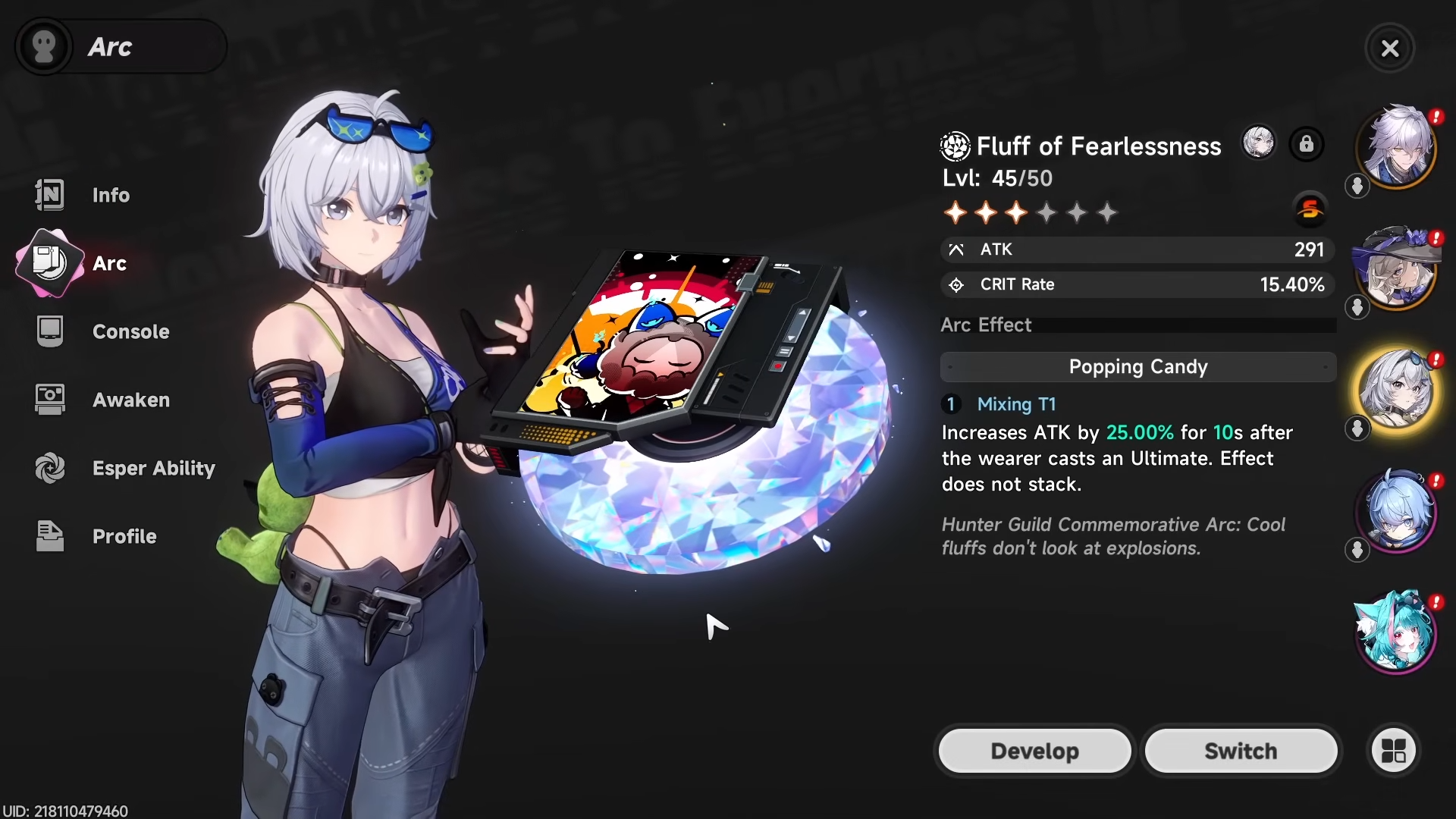 Arcs are the game’s weapons, and a character can only equip Arcs that match their archetype. Arcs have flat attack, a main stat, and an effect, and duplicates can be combined in the develop tab to increase strength.