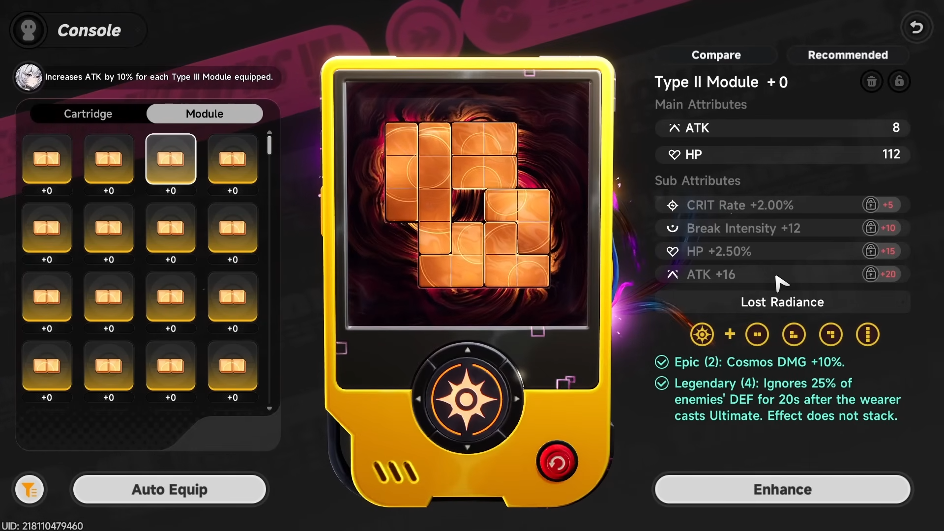 Modules have two main stats and four sub-stats, but the sub-stats are locked until you level the piece. Since sub-stats are pre-rolled, you can inspect them before investing, which makes this system much more efficient than blindly upgrading.