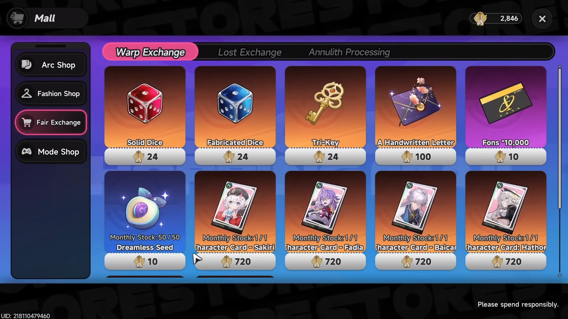 The shop includes arc exchange, fashion, and fair exchange sections. You can trade banner currencies for more pulls, buy A-class Arcs with commission currency, and purchase some cosmetics with funds while others require premium currency.
