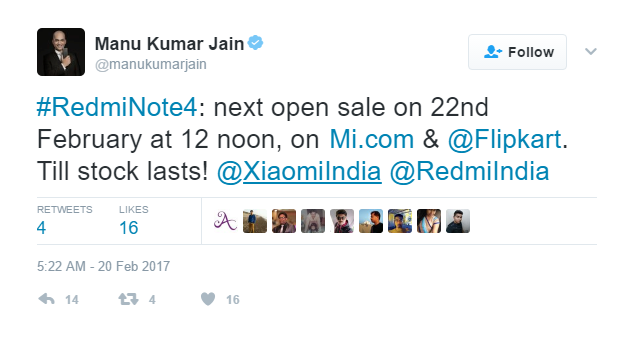 The successor to the hugely popular Redmi Note 3 from Xiaomi will be up for a flash sale again on February 22, Wednesday, as we got to learn from a tweet from Xiaomi’s VP, Manu Kumar Jain. The smartphone will be sold through online outlets, Flipkart.com and Xiaomi’s own website, Mi.com.