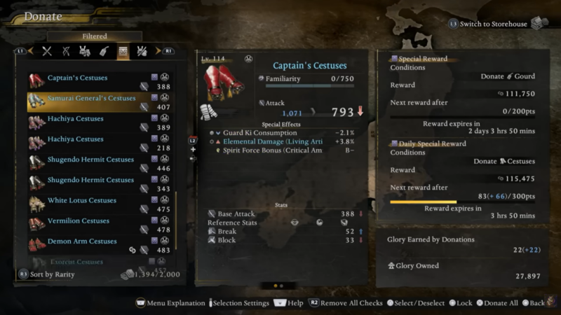 Blue rarity gear provides a particularly efficient Glory-to-item ratio. While higher rarity equipment can also yield solid returns, you generally gain better long-term value by donating mid-tier gear you do not plan to dismantle for crafting materials. The system also rotates daily special donation targets, such as specific weapon types or items like gourds or cestuses. When you donate these highlighted items, you receive a significantly larger Glory payout along with bonus gold.