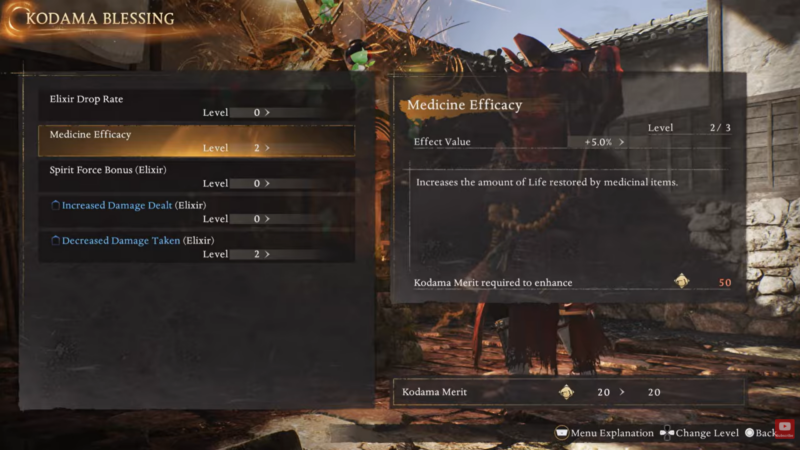 Kodamas are small, hidden spirits scattered throughout missions, and they are one of the most important sources of healing upgrades early in the game. Each Kodama you find increases the number of elixirs you start with when entering missions. Over time, this dramatically reduces how often you run out of healing during difficult encounters.