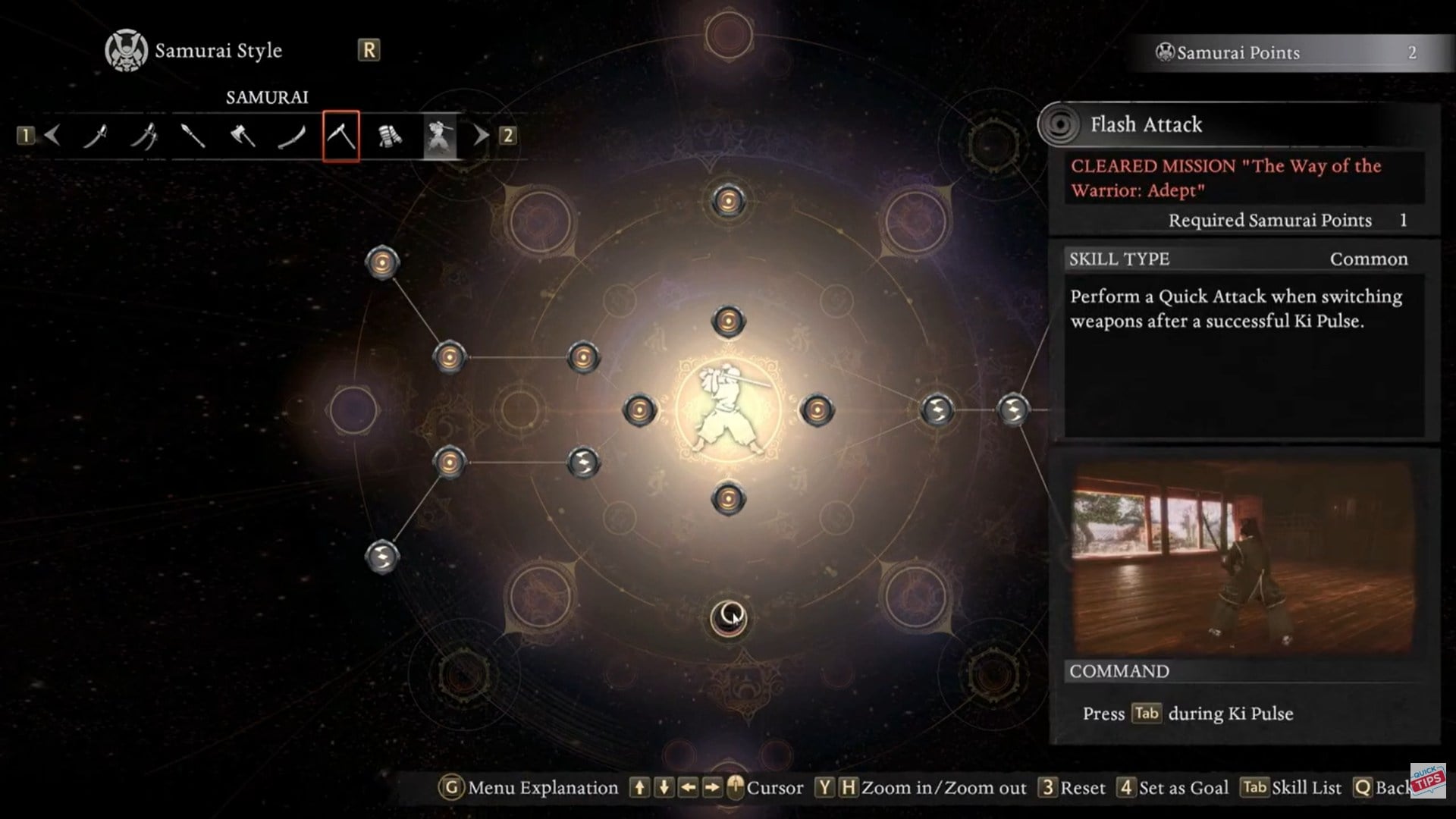 Flash Attack costs 1 Samurai Point to unlock, but leveling Martial Arts in the Samurai tree improves its scaling and integration.