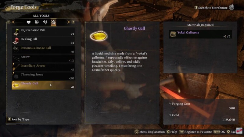 The inclusion of Ghostly Gall crafting reinforces the game’s loop between combat rewards and blacksmith progression.