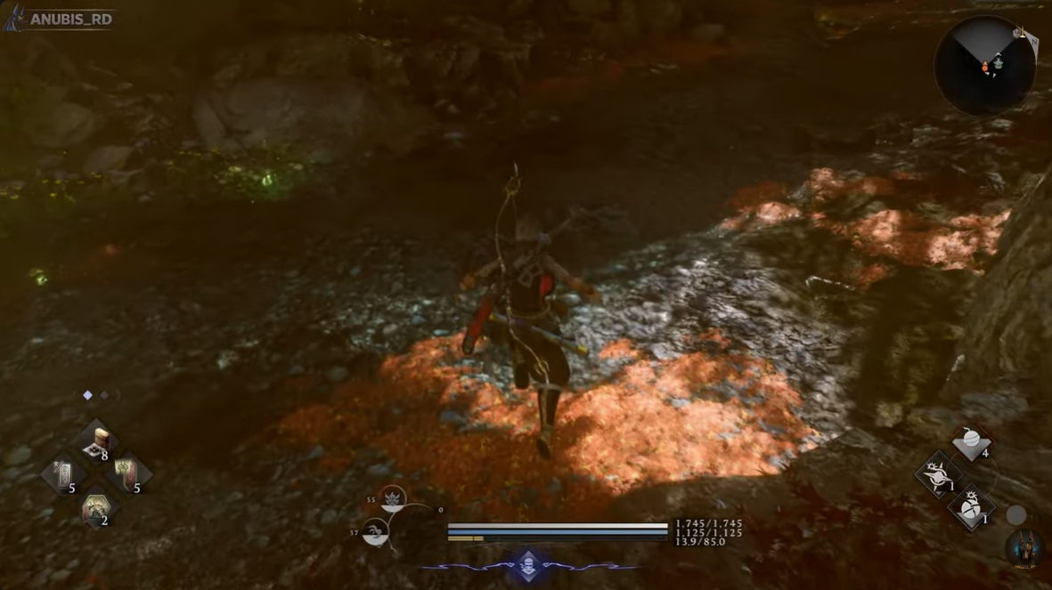 From the shrine, move downward along the main path and then veer to the right toward a smaller waterfall section. This location appears decorative at first glance. If you do not have the Guardian Spirit equipped, nothing unusual happens.