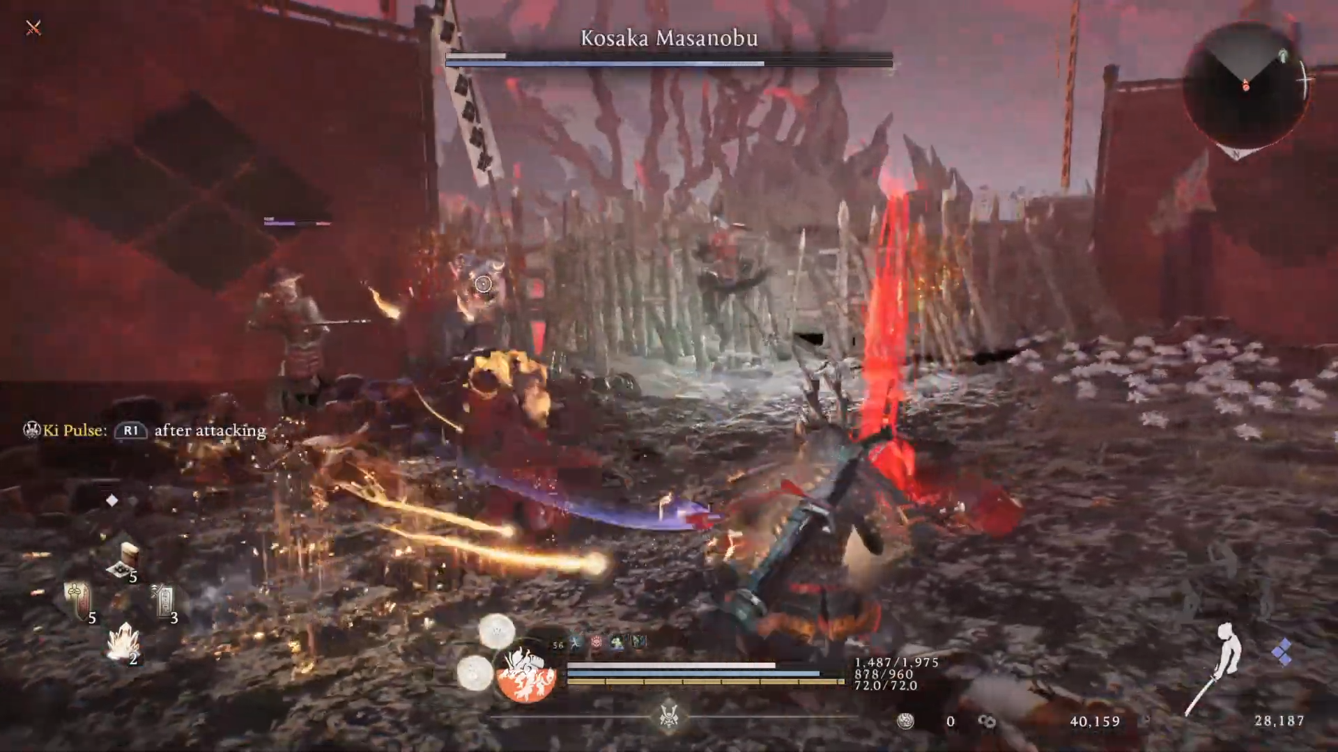 Defeat Kosaka Masanobu—he summons fire waves and melee combos; dodge his lunges and punish openings with Ki-damaging attacks.
