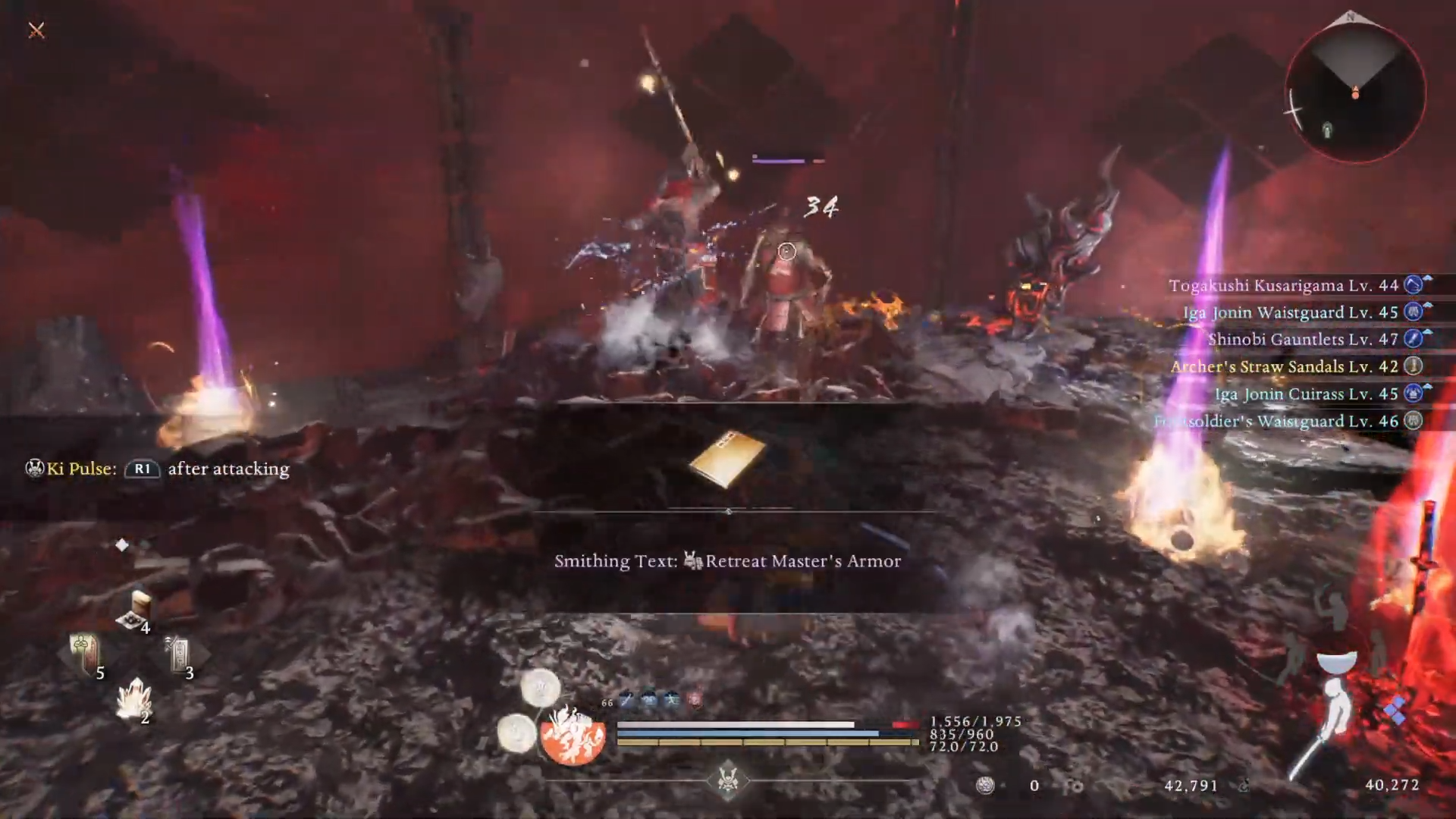 | Kosaka Masanobu (Boss) | Smithing Text: Retreat Master’s Armor (100% first clear), Amrita, random gear/materials. |