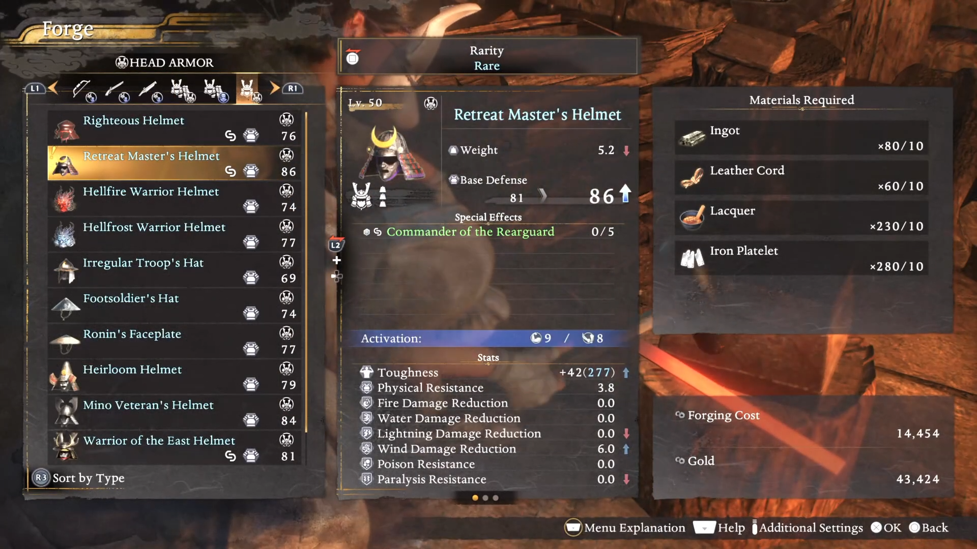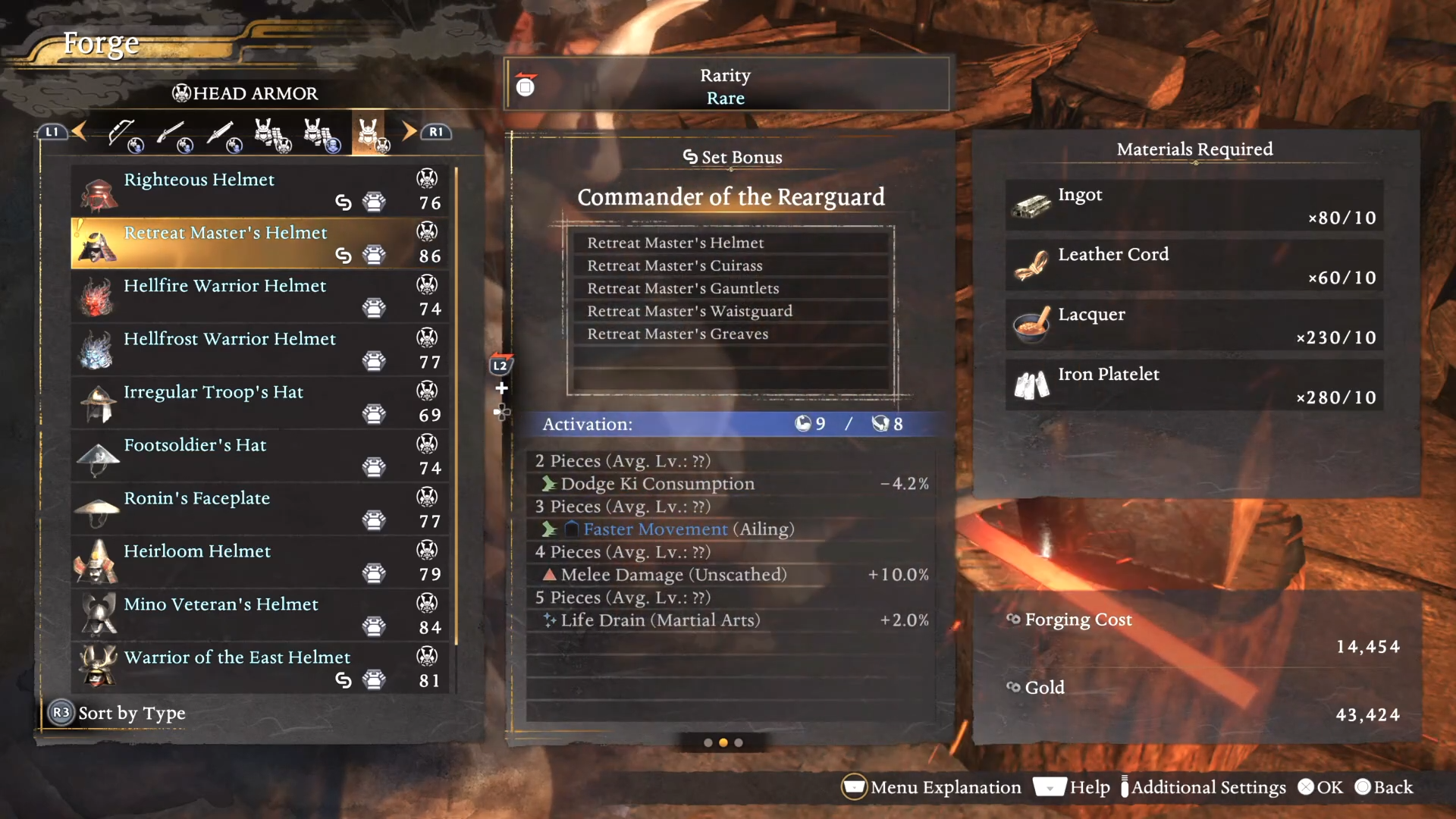 Select “Forge,” navigate to Armor > Retreat Master’s set pieces (helmet, chest, arms, waist, legs).