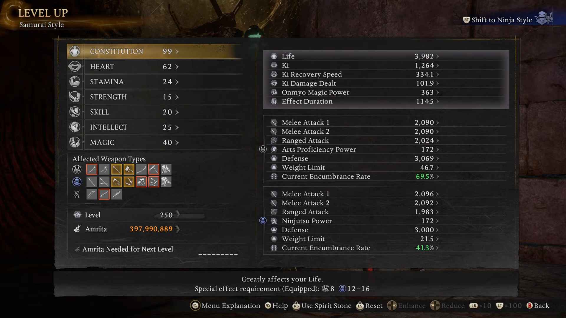 Pump Constitution to 99 for maximum health, making you durable in close-range fights. Heart reaches 62 as secondary for sustain, Stamina hits 24 once gear upgrades for stamina management, Strength at 15 meets requirements, Skill at 20 boosts ninjutsu breakpoints, Intellect at 25 extends effect durations, and Magic at 40 unlocks Omamori slots. These ensure you frontline bosses without crumbling.