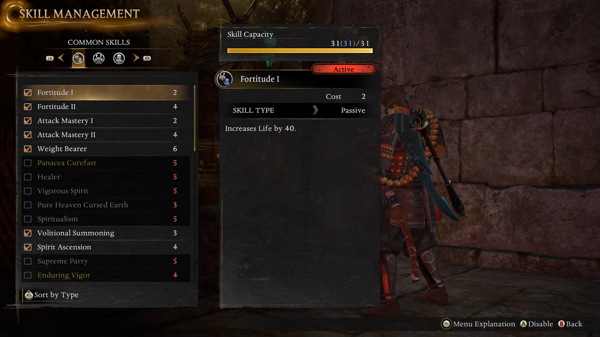Common skills include Double Fortitude, Double Attack, Weightbearer, Valitional, Spirit Ascension, Awakening, and Amplification for fast multi-buffing.