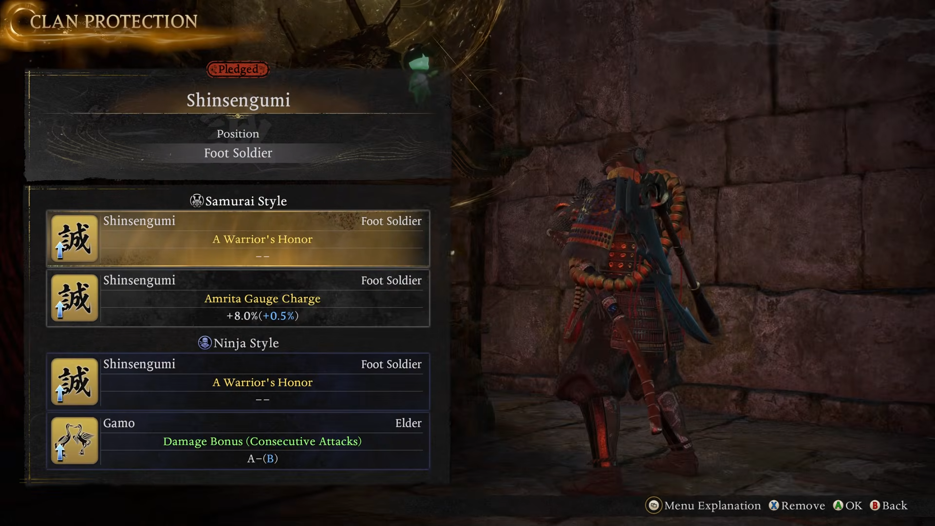 Shinsengumi clan for Warrior’s Honor (huge damage buff, penalty on back hits—stay frontal). Pair with Honda clan skill damage (up to 14.2% at high rank). Level clans to mid-tier (Minister/Elder) before switching to retain perks.